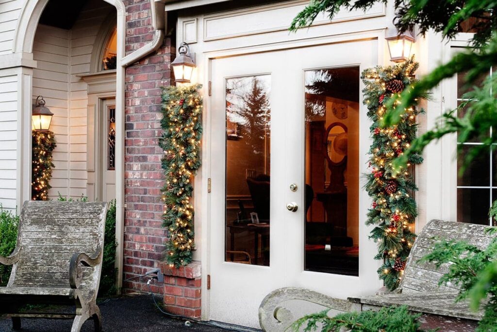 If you’re looking for an upscale way to welcome the holiday season, topiaries framing your front door could be the way to go. Don’t worry; you won’t need to have a green thumb to add this touch of garden elegance to your entryway. You can find artificial topiaries at many stores focused on home decor. Add a string of ornaments wrapped around the topiary or even find one shaped like a tree or gift. Just add a bow to the top to complete the festive cheer!